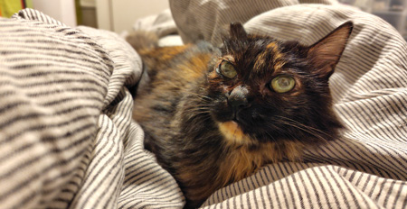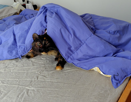 さてさて。これはちょっと前の写真なのですが、先週末シーツ交換をした時のもふこ。布団に中にもぐり込んで、じゃれていました。かわいいので、アップします。