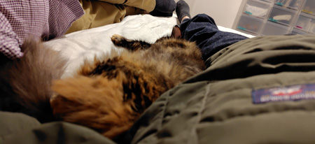 それでも、もふこに呼ばれれば、一緒に休むのがシモベの勤め。もふこは膝には乗らず、こうして平場でくっつくのが好きなんです。