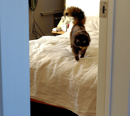 ただし、もふこはもっと寝ていたいよう。ニンゲンが起き出しても、こうしてベッドに粘ろうとしたりするんですよ。