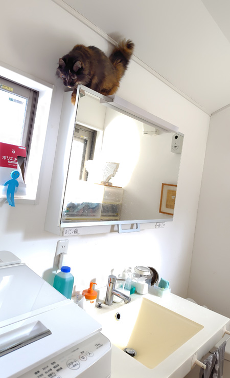 洗濯機を踏み台に、洗面台の上に上がり降りする姿は、なかなか精悍です。上下運動が多い時は元気なんじゃないかな。