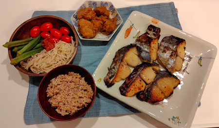 今日の晩ごはんは、サワラの味噌漬けとご飯。サワラは焼鯛と一緒にいただいたものです。