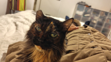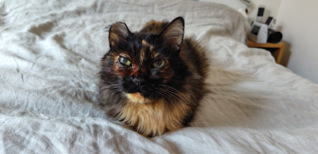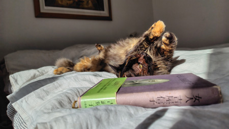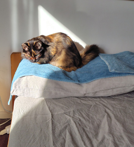 開始が少し遅くなり、ベッドに日が入ってきました。日なたぼっこを待てないもふこは、シーツ交換の済んでいる部分で日なたぼっこ。早く終わらせろと圧をかけているようです。