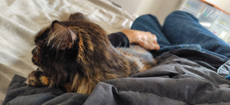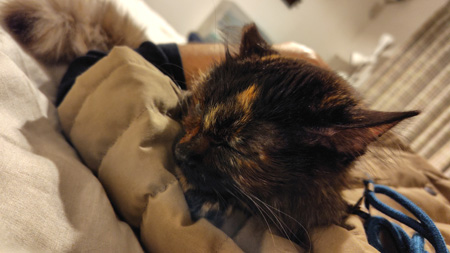 もふこは相変わらず食が進まず、私が口に入れて食べさせ続けています。それでも体重は現状維持で、3.35~3.40キロあたりを行ったり来たり。なかなか増えないなあ。具合は悪くないようなので、この調子で続けていくつもりです。