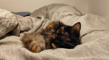 これは今朝のもふこ。毎晩こうして、シモベ(ニンゲン)とともに気持ちよさそうに寝ています。